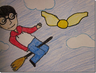 Harry catching his first Snitch. Yes, I should’ve actually had him wearing a Quidditch uniform, but I drew a whole series of Harry pictures and I had him wearing the same outfit everytime. And you can’t see his scar in this picture.